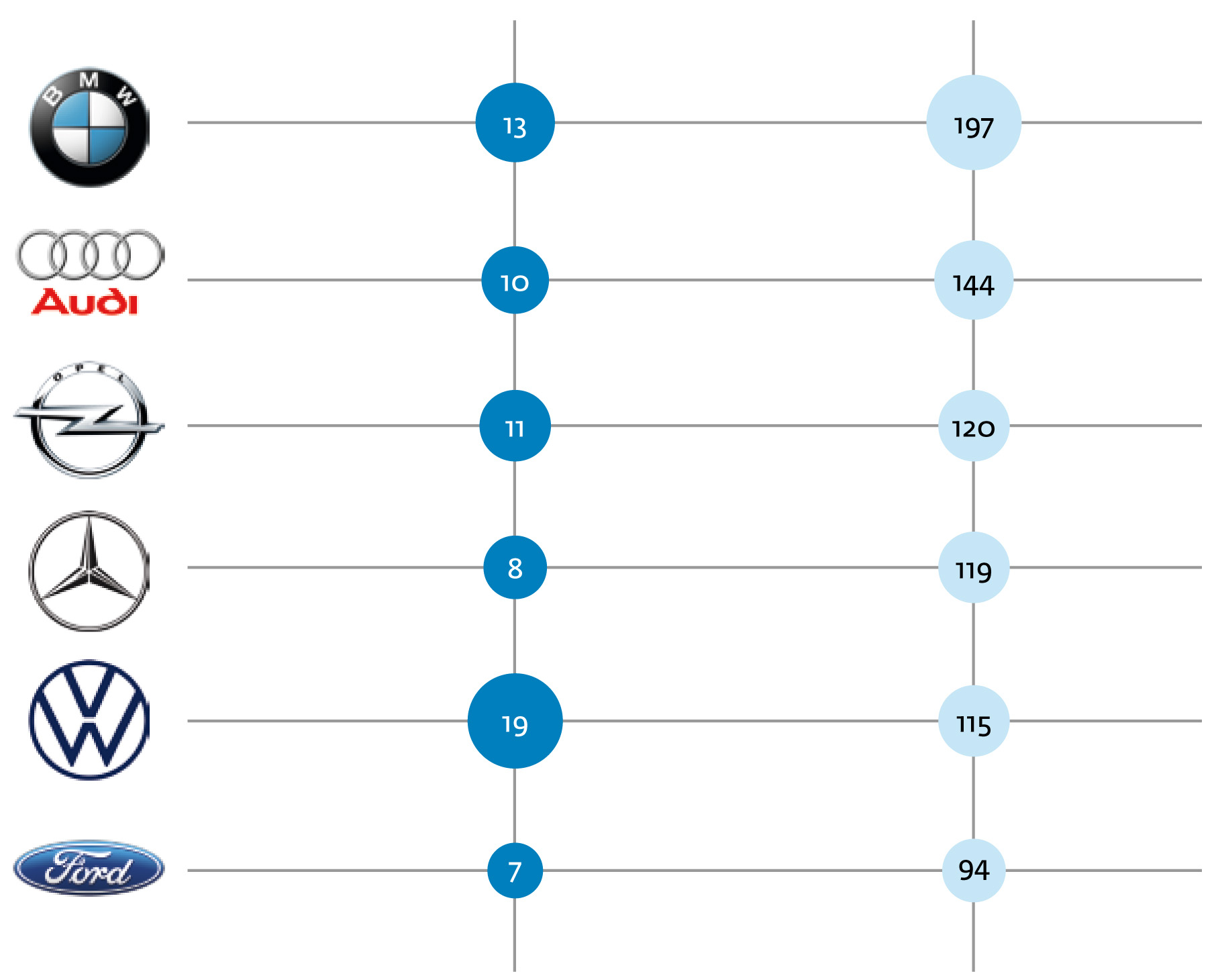 Bayerische Immobilienbesitzer lassen sich nicht auf eine Automarke festlegen, sie haben im Durchschnitt drei Marken, die bei einer Neuanschaffung in Frage kommen. Hier sind die am häufigsten genutzten Automarken: