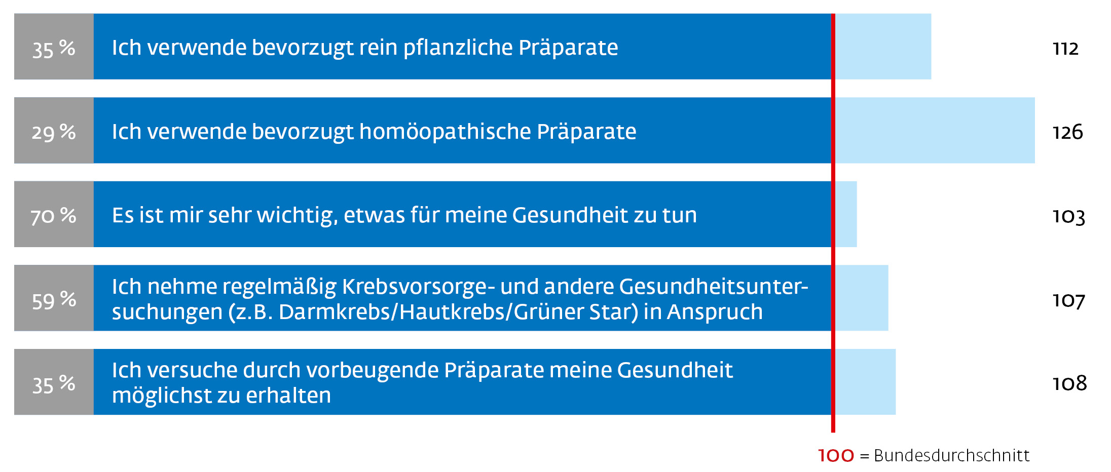Gesundheitsbewusst? Na klar, das sind die bayerischen Immobilienbesitzer! Dabei sind sie durchaus offen für alternative Heilmethoden. Auch die Fitness ist wichtig. Etwa die Hälfte von ihnen wird regelmäßig von Freunden und Bekannten zum Thema Gesundheit um Rat gefragt.