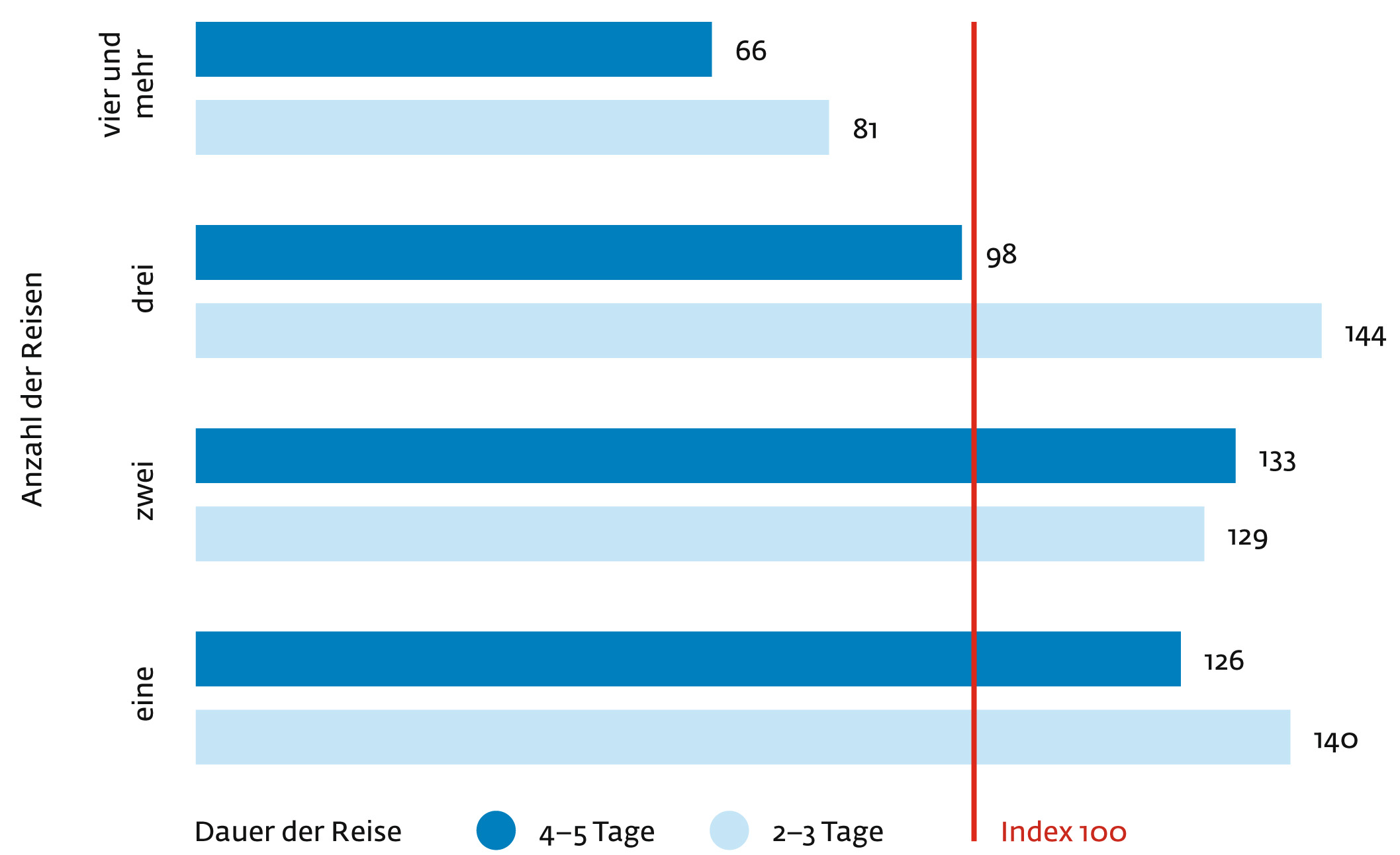 Hinzu kommen dann noch mehrere Kurzreisen von unterschiedlicher Dauer im Jahr. Die Balkenlänge gibt den Indexwert zum Schnitt der Bevölkerung an (100%):