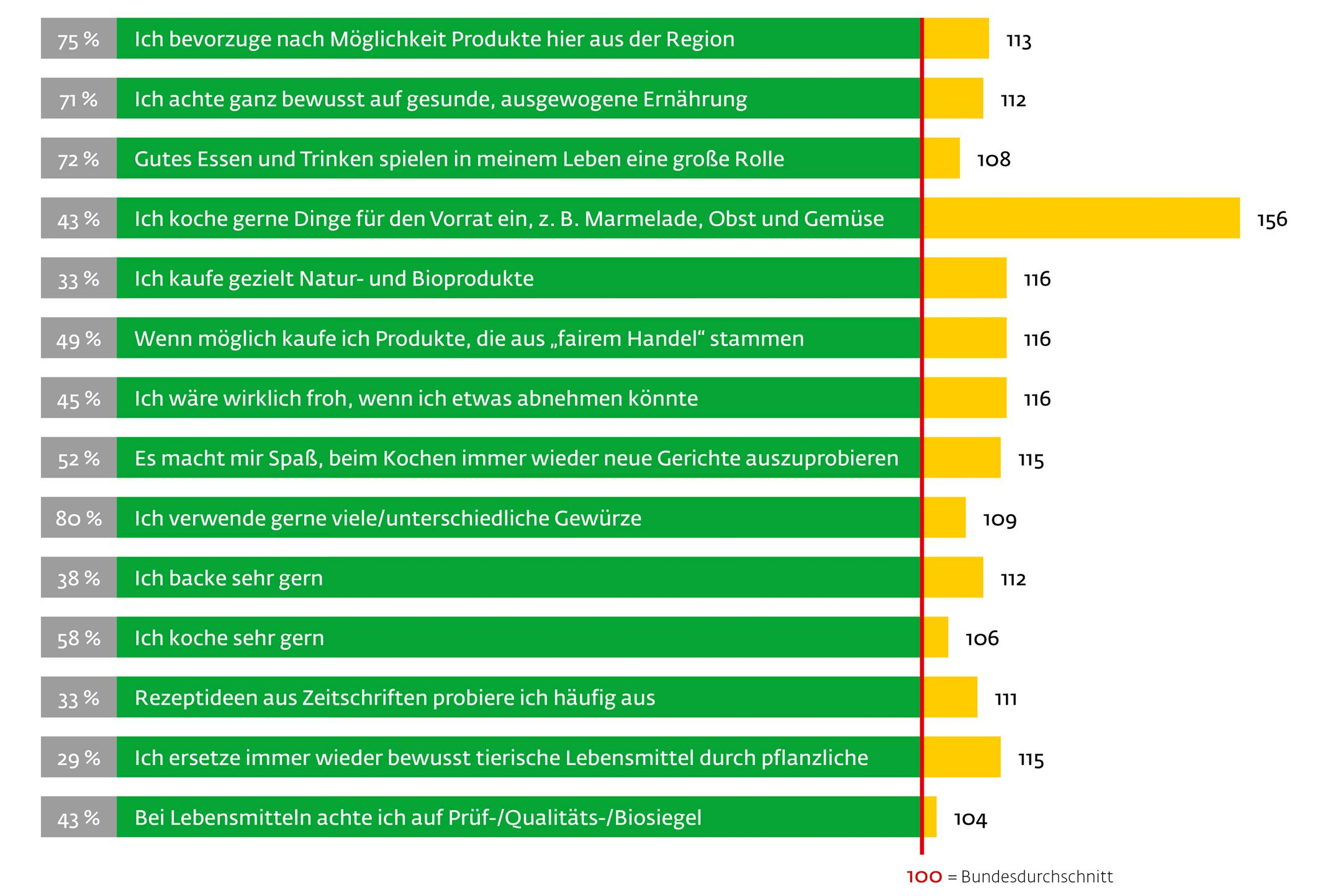 Unsere Zielgruppe achtet sehr und auch wieder überdurchschnittlich auf gesunde  Ernährung, gerne auch bio und fair. Es werden häufig neue Rezepte ausprobiert  und es wird abwechslungsreich gekocht.So sagen z.B. 75 % der Zielgruppe, dass sie nach Möglichkeit Produkte aus der Region  bevorzugen, womit sie 13 % über dem Durchschnitt der Bevölkerung liegen: