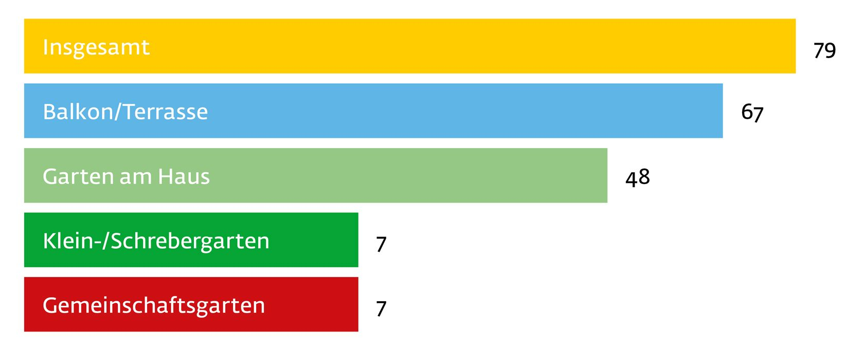 Der Kleingarten ist ein kommunikativer Rückzugsort. Hier kann man allein Ruhe und Erholung finden oder mit anderen Menschen zusammenkommen und sich austauschen. Die Anziehungskraft des Gartens weitet sich natürlich auch auf die Familie und Freunde aus. Statistisch kommen auf jeden Kleingärtner mehr als vier weiter Nutzer des Gartens (Nennung in %).