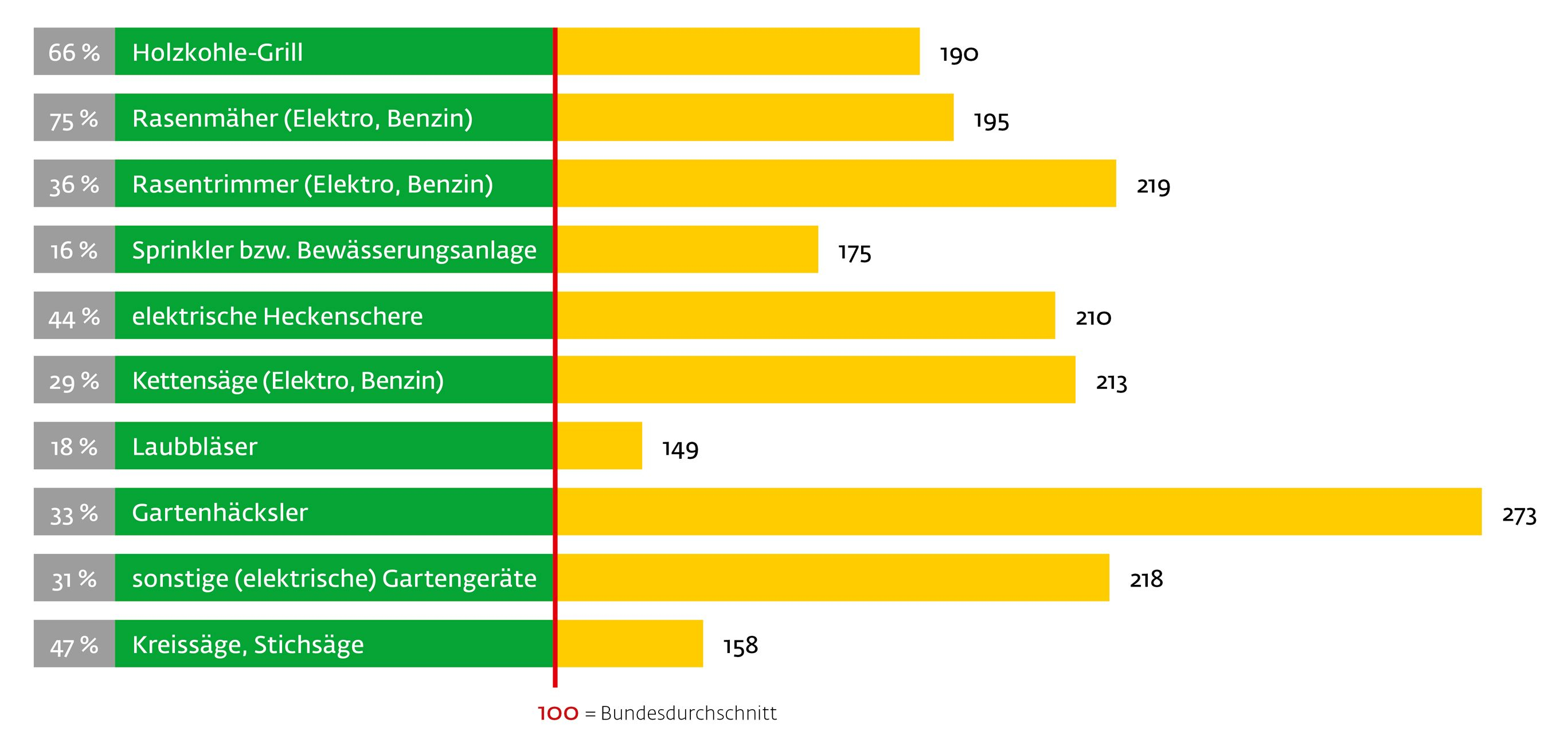 Die Kleingärtner halten einen deutlich überdurchschnittlichen Bestand an Heimwerker-geräten im Haushalt vor, hier eine Auswahl der deutlichsten Abweichungen zum Schnitt (= 100) mit prozentualer Häufigkeit der Nennung:
